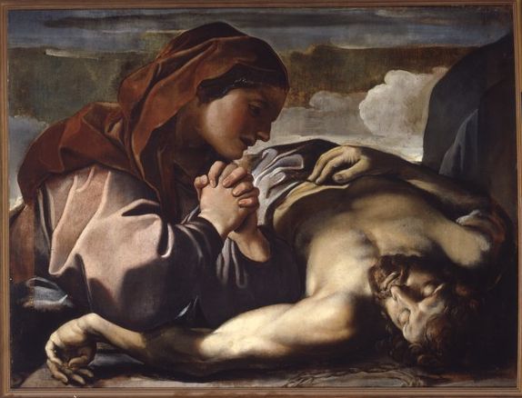 Definita inizialmente come una copia da Tiarini nell’inventario dei dipinti del conte Giacomo Zambeccari (1796), la tela fu successivamente riconosciuta come opera autografa del pittore bolognese. La scena si distingue per il suo carattere drammatico, accentuato dai toni bruni della composizione, mentre il taglio angolato e il forte scorcio del corpo di Cristo, verso cui si protende la Vergine, conferiscono un’immediatezza e intensità all’episodio dipinto.