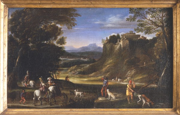 Il dipinto, datato al 1603 circa, si inserisce tra i primi esempi della produzione del Domenichino. La scena è caratterizzata da una composizione dinamica e vivace, tipica delle opere giovanili del pittore, e riflette l’influenza della tradizione paesaggistica rinnovata dal maestro Annibale Carracci. In primo piano, sulla destra, un servo fa dissetare due levrieri lungo un ruscello, mentre al centro un uomo suona il corno; a sinistra due cavalieri, seguiti da un paggetto, avanzano verso il centro della scena e alle loro spalle un uomo a cavallo si addentra nel bosco.