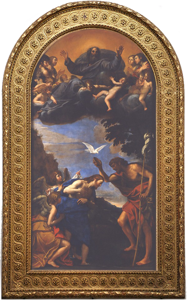 Destinata alla chiesa dei Servi di Maria di San Giorgio in Poggiale, la pala d’altare è la prima grande commissione che l’artista riceve dopo il suo primo rientro a Bologna dal lungo soggiorno romano ed è considerato uno dei suoi principali capolavori a soggetto sacro. La scena è ambientata in un paesaggio spoglio e scuro, con l’eccezione della chioma di un albero che emerge sul lato destro del dipinto. Gesù e Giovanni Battista occupano il centro della composizione: Gesù, a destra, indossa un mantello blu scuro e si inchina verso Giovanni, che solleva una ciotola con l’acqua del fiume Giordano per versarla sulla testa di Cristo in corrispondenza della quale compare la colomba dello Spirito Santo. Due angeli si trovano a sinistra dietro Gesù, uno dei quali offre un telo bianco, simbolo del suo futuro sacrificio. In alto, Dio Padre, circondato da angeli e putti, osserva la scena e benedice con le braccia aperte, dominando l’intera composizione.