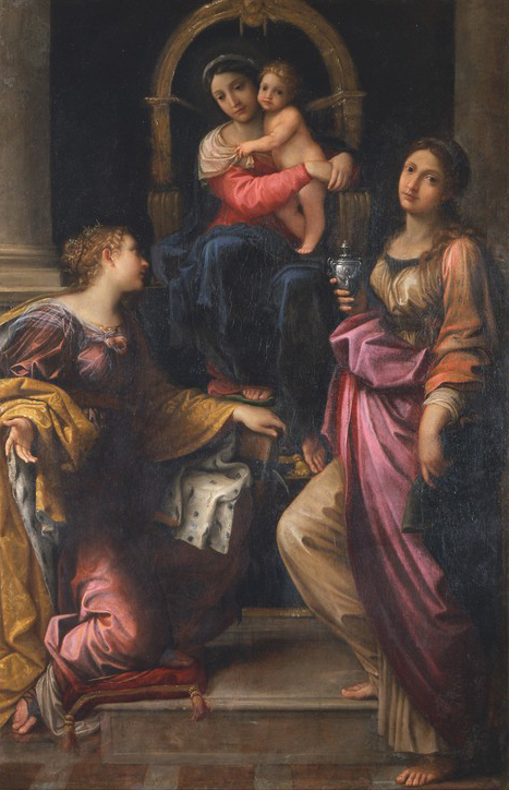 Collocata originariamente sull’altare della cappella di proprietà della famiglia Artemini nella chiesa parrocchiale dei Santi Fabiano e Sebastiano a Bologna, la pala è la prima opera datata di Francesco Albani (1599), realizzata circa due anni prima del suo trasferimento a Roma. Al centro della composizione compare la Madonna col Bambino in trono e in primo piano si dispongono santa Caterina d’Alessandria, inginocchiata sulla sinistra, e Maria Maddalena che volge lo sguardo allo spettatore, sulla destra. La composizione si ispira ai modelli lasciati da Annibale Carracci in città, in particolare alla pala raffigurante la Madonna con il Bambino e San Giovannino tra i santi Giovanni Evangelista e Caterina d’Alessandria, opera firmata e datata 1593, anch’essa conservata presso la Pinacoteca Nazionale di Bologna.