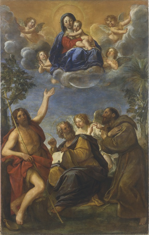 Commissionata nel 1639 dalla comunità di San Giovanni in Persiceto per l’altare maggiore della nuova chiesa dei Cappuccini dedicata a San Matteo, l’opera entra nelle collezioni della Pinacoteca di Bologna nel 1816, nel periodo successivo alle soppressioni napoleoniche (1797-1810). Nonostante le ripetute richieste avanzate dalla municipalità della cittadina emiliana, l’opera non è mai stata restituita al suo luogo d’origine. La scena raffigura in alto la Madonna col Bambino tra le nuvole circondati da quattro putti, due per ogni lato. In primo piano, da sinistra verso destra, sono raffigurati i santi Giovanni Battista che si rivolge all’osservatore indicando il cielo con il braccio sinistro, Matteo che scrive il Vangelo con l’aiuto dell’angelo posto alle sue spalle e Francesco che volge lo sguardo in alto con le braccia incrociate sul petto in segno di adorazione. Purtroppo l’attuale stato di conservazione non permette di apprezzare completamente la raffinatezza dei toni, sebbene alcuni delicati dettagli, come l’angelo che suggerisce il testo a san Matteo, siano ancora molto visibili.