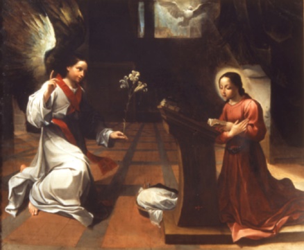 Nel 1584, Ludovico Carracci dipinse Maria, sobriamente abbigliata, impegnata nella lettura di un libro di preghiere. L’angelo con in mano un giglio annuncia alla Vergine il concepimento di Cristo, mentre una folata di vento apre una finestra, attraverso cui entra la colomba dello Spirito Santo. Il sacro, qui, non appare come un evento straordinario ma come un’esperienza quotidiana e vicina, tanto che sullo sfondo, oltre la finestra, si intravede la città di Bologna con le sue torri.